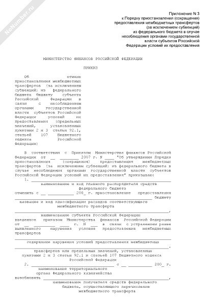 - 725Приказ об отмене приостановления межбюджетных трансфертов (за исключением субвенций) из федерального бюджета бюджету субъекта Российской Федерации в связи с несоблюдением органами государственной власти субъектов Российской Федерации условий их предоставления (предельных значений, установленных пунктами 2 и 3 статьи 92.1, статьей 107 Бюджетного кодекса Российской Федерации)