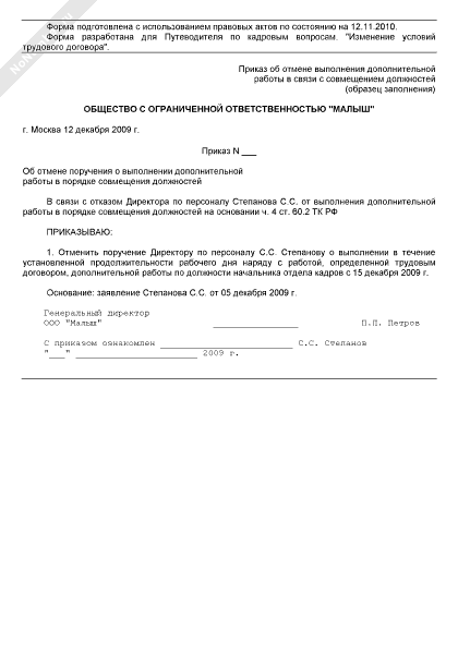 - 728Приказ об отмене выполнения дополнительной работы в связи с совмещением должностей