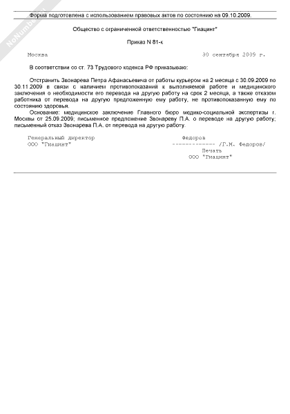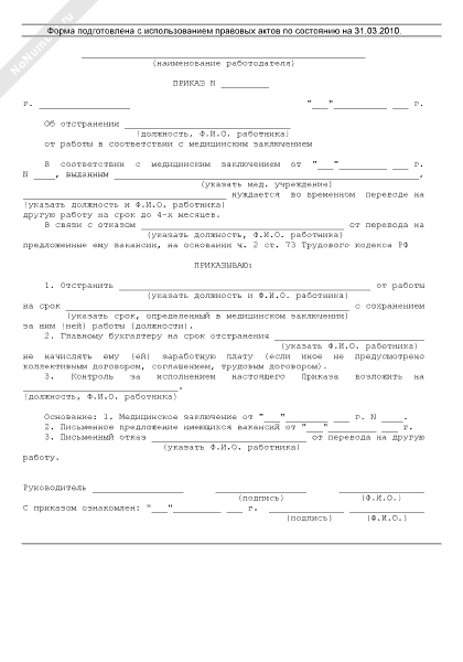- 737Приказ об отстранении от работы в связи с отказом работника от перевода на другую предложенную ему работу, не противопоказанную ему по состоянию здоровья