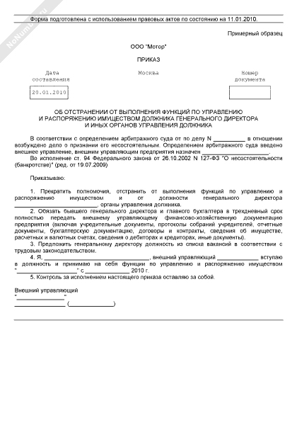 - 735Приказ об отстранении от выполнения функций по управлению и распоряжению имуществом должника генерального директора и иных органов управления должника