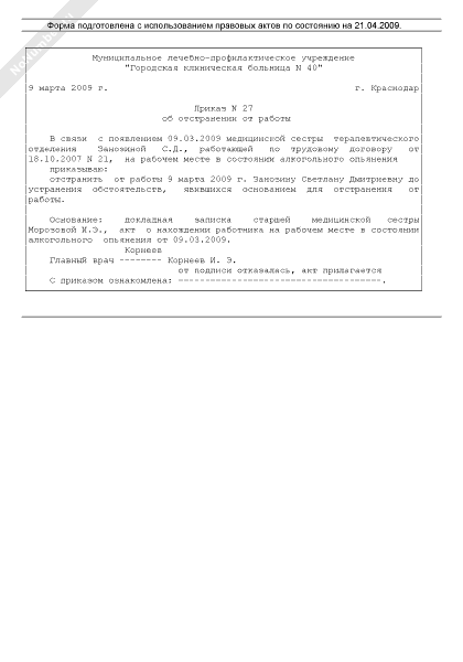 - 738Приказ об отстранении работника в связи с появлением на работе в состоянии алкогольного опьянения