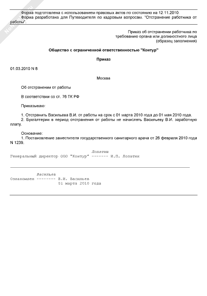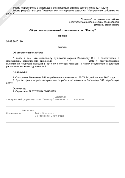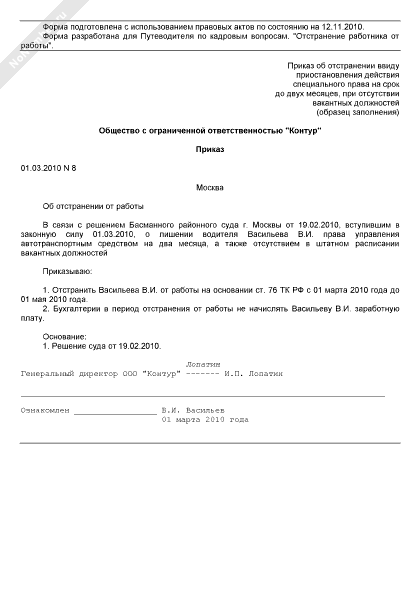 - 742Приказ об отстранении ввиду приостановления действия специального права на срок до двух месяцев, при отсутствии вакантных должностей
