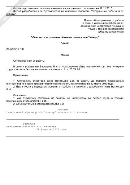 - 741Приказ об отстранении от работы в связи с уклонением работника от прохождения инструктажа по охране труда и технике безопасности