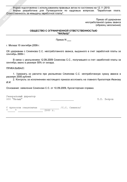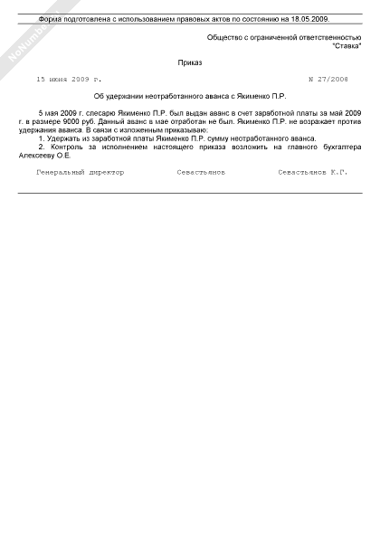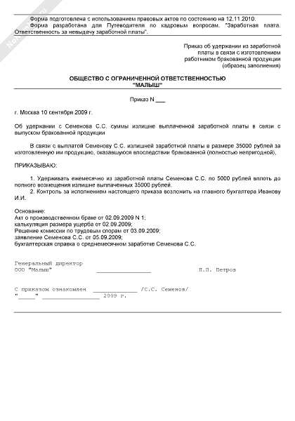 - 755Приказ об удержании из заработной платы в связи с изготовлением работником бракованной продукции