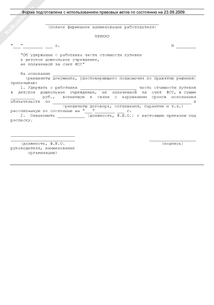 - 753Приказ об удержании с работника части стоимости путевки в детское оздоровительное учреждение, не оплаченной за счет ФСС (с ознакомлением работника под роспись)