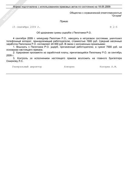 - 754Приказ об удержании из заработка работника ущерба, причиненного работодателю