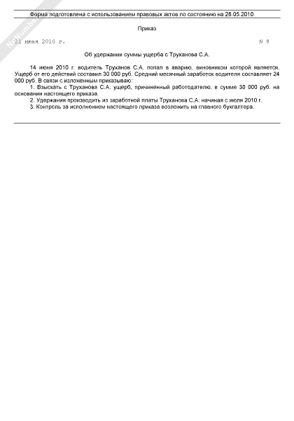 - 758Приказ об удержании суммы ущерба с водителя организации, причиненного вследствие произошедшего по его вине дорожно-транспортного происшествия