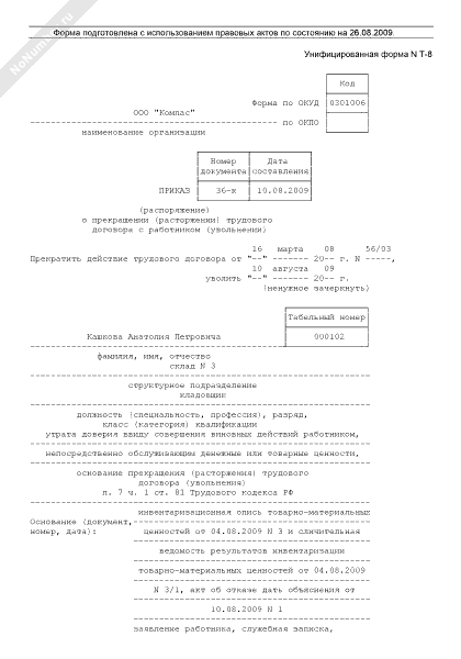 - 748Приказ об увольнении работника, непосредственно обслуживающего денежные или товарные ценности, в связи с совершением им виновных действий, если эти действия дают основание для утраты доверия к нему со стороны работодателя. Унифицированная форма № Т-8