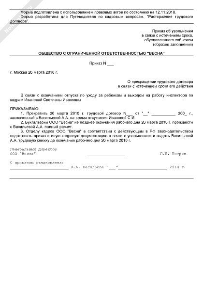 - 750Приказ об увольнении в связи с истечением срока, обусловленного событием
