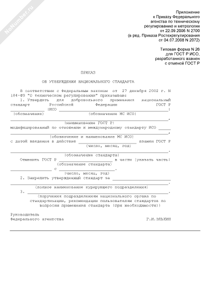 - 801Приказ об утверждении национального стандарта (для ГОСТ Р ИСО, разработанного взамен с отменой ГОСТ Р) (типовая форма № 26)