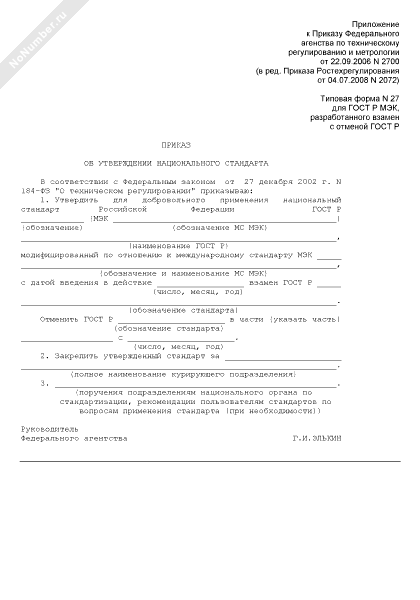 - 802Приказ об утверждении национального стандарта (для ГОСТ Р МЭК, разработанного взамен с отменой ГОСТ Р) (типовая форма № 27)