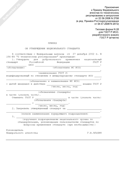 - 805Приказ об утверждении национального стандарта (для ГОСТ Р ИСО, разработанного взамен ГОСТ Р) (типовая форма № 20)