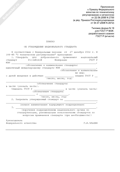 - 806Приказ об утверждении национального стандарта (для ГОСТ Р МЭК, разработанного взамен ГОСТ Р) (типовая форма № 19)