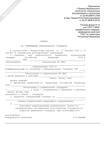 - 807Приказ об утверждении национального стандарта (для ГОСТ Р МЭК, разработанного впервые, прекращение действия ГОСТ на территории Российской Федерации) (типовая форма № 15)