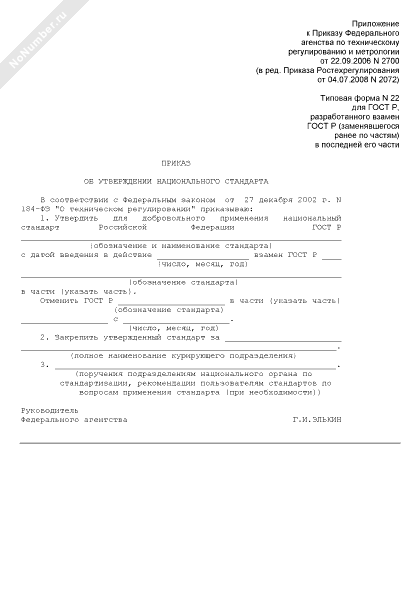 - 803Приказ об утверждении национального стандарта (для ГОСТ Р, разработанного взамен ГОСТ Р (заменявшегося ранее по частям) в последней его части) (типовая форма № 22)