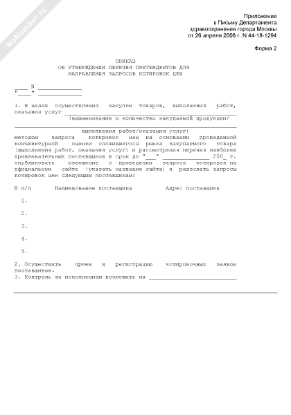 - 813Приказ об утверждении перечня претендентов для направления запросов котировок цен при закупке товаров (выполнения работ, оказания услуг) для нужд лечебно-профилактических учреждений и структурных подразделений Департамента здравоохранения города Москвы (форма № 2)