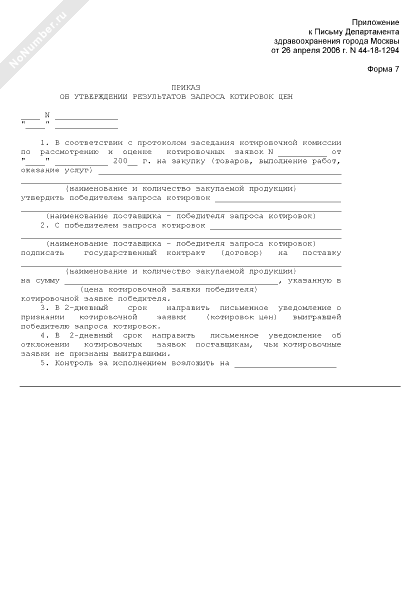 - 814Приказ об утверждении результатов запроса котировок цен на закупку товаров (выполнение работ, оказание услуг) для нужд лечебно-профилактических учреждений и структурных подразделений Департамента здравоохранения города Москвы (форма № 7)