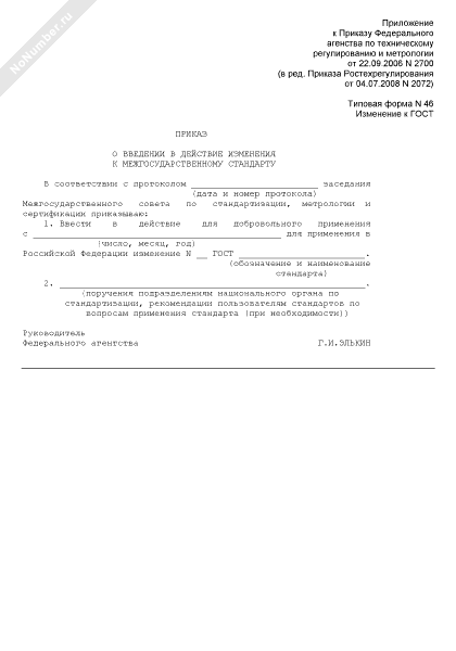 - 106Приказ о введении в действие изменений к межгосударственному стандарту (изменение к ГОСТ) (типовая форма № 46)