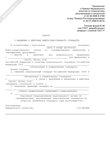 - 115Приказ о введении в действие межгосударственного стандарта (для ГОСТ, разработанного впервые с отменой ГОСТ Р) (типовая форма № 36)