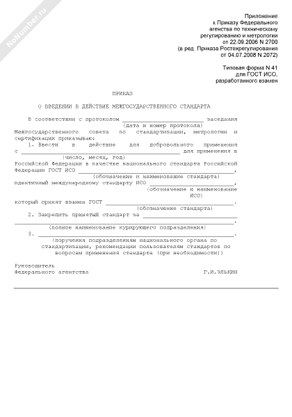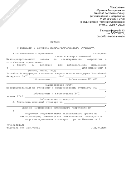 - 116Приказ о введении в действие межгосударственного стандарта (для ГОСТ ИСО, разработанного взамен) (типовая форма № 43)