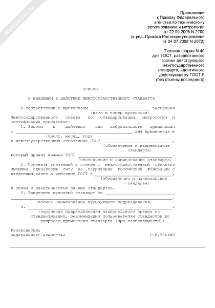 - 104Приказ о введении в действие межгосударственного стандарта (для ГОСТ, разработанного взамен действующего межгосударственного стандарта, идентичного действующему ГОСТ Р (без отмены последнего)) (типовая форма № 40)
