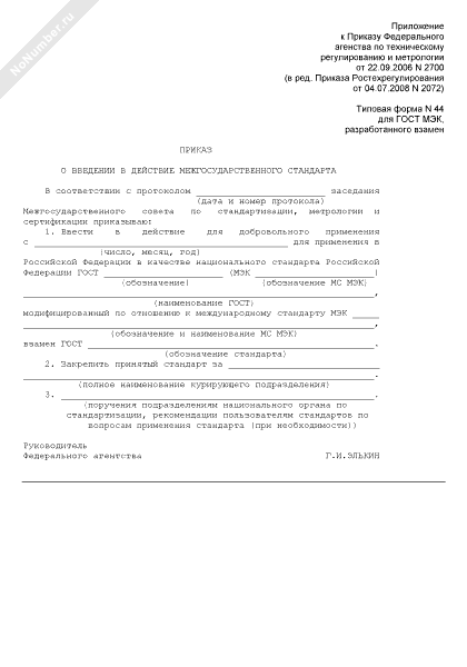 - 107Приказ о введении в действие межгосударственного стандарта (для ГОСТ МЭК, разработанного взамен) (типовая форма № 44)