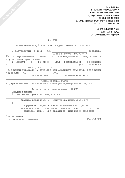 - 110Приказ о введении в действие межгосударственного стандарта (для ГОСТ ИСО, разработанного впервые) (типовая форма № 34)
