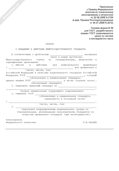 - 108Приказ о введении в действие межгосударственного стандарта (для ГОСТ, разработанного взамен ГОСТ (заменявшегося ранее по частям) в последней его части) (типовая форма № 39)
