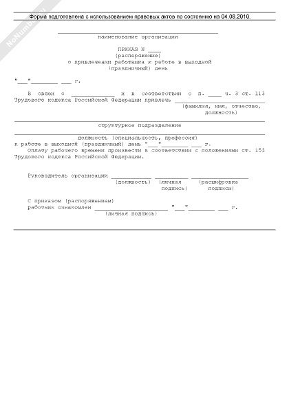 Приказ о привлечении работника к работе в выходной (праздничный) день