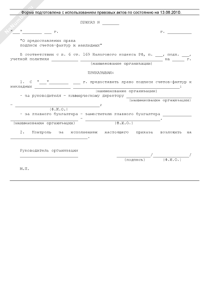 Приказ о предоставлении права подписи счетов-фактур и накладных