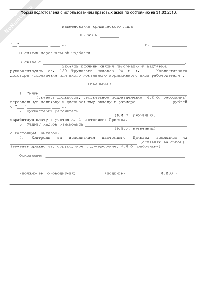 Приказ об установлении ежемесячной процентной надбавки за работу со сведениями, составляющими государственную тайну (рекомендуемый образец заполнения)