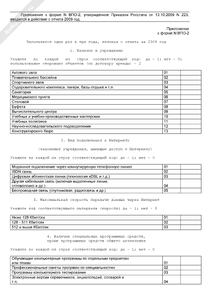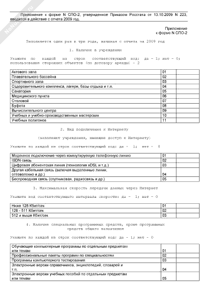 - 250Приложение к форме № СПО-2 (заполняется один раз в три года, начиная с отчета за 2009 год)