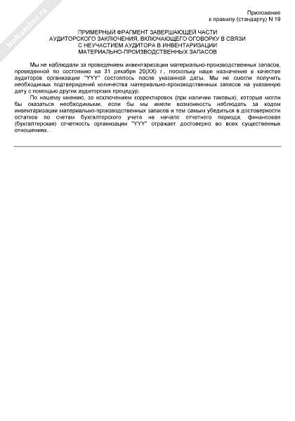 - 258Примерный фрагмент завершающей части аудиторского заключения, включающего оговорку в связи с неучастием аудитора в инвентаризации материально-производственных запасов (приложение к федеральному правилу (стандарту) аудиторской деятельности «Особенности первой проверки аудируемого лица»)
