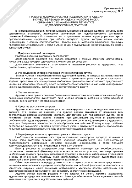 - 260Примеры модифицирования аудиторских процедур в качестве реакции на оценку факторов риска, связанных с искажениями в результате недобросовестных действий (приложение к федеральному правилу (стандарту) аудиторской деятельности «Обязанности аудитора по рассмотрению ошибок и недобросовестных действий в ходе аудита»)