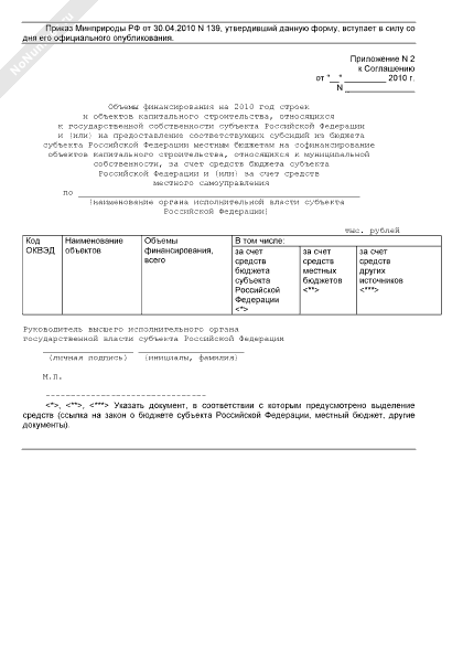 - 124Объемы финансирования объекта капитального строительства, относящегося к государственной собственности субъекта Российской Федерации (приложение к соглашению о предоставлении в 2010 году субсидии за счет бюджетных ассигнований федерального бюджета, главным распорядителем средств федерального бюджета в отношении которых является Федеральная служба по надзору в сфере природопользования)