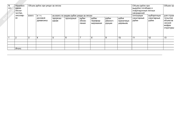 - 121Объемы рубок лесных насаждений при осуществлении ухода за лесом, вырубке погибших и поврежденных лесных насаждений, прочих рубок, а также на лесных участках, предназначенных для строительства, реконструкции и эксплуатации объектов (приложение к типовой форме лесного плана субъекта Российской Федерации)