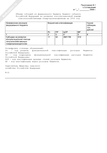 - 123Объемы субсидий из федерального бюджета бюджету субъекта Российской Федерации на развитие консультационной помощи сельскохозяйственным товаропроизводителям на 2009 год (приложение к соглашению о порядке предоставления субсидии)
