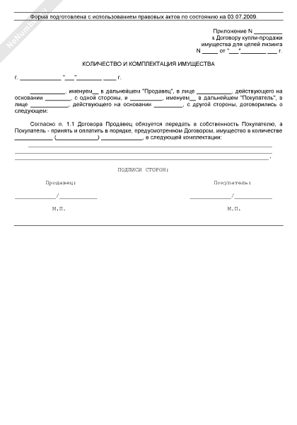 Количество и комплектация имущества (приложение к договору купли-продажи имущества для целей лизинга)