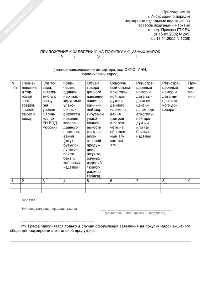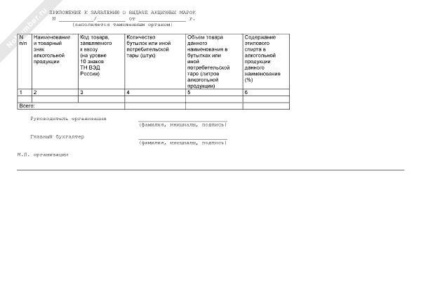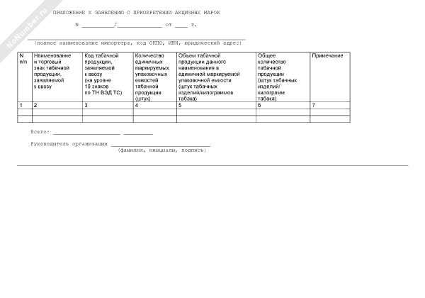 Приложение к заявлению на покупку акцизных марок (рекомендуемый образец заполнения)