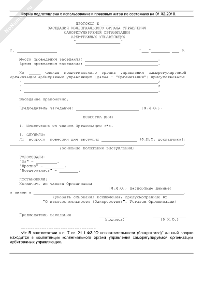 - 406Протокол заседания органа, осуществляющего контроль за соблюдением членами саморегулируемой организации арбитражных управляющих требований федеральных законов, иных нормативных правовых актов Российской Федерации, федеральных стандартов, стандартов и правил профессиональной деятельности