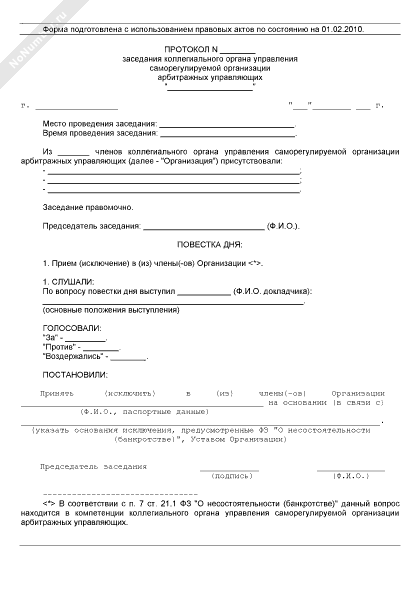 - 415Протокол заседания коллегиального органа управления саморегулируемой организации арбитражных управляющих по вопросу об исключении лица из членов саморегулируемой организации