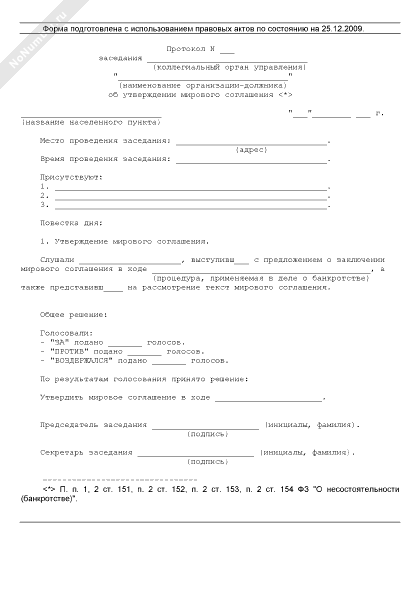 - 414Протокол заседания коллегиального органа управления юридического лица — должника об утверждении мирового соглашения
