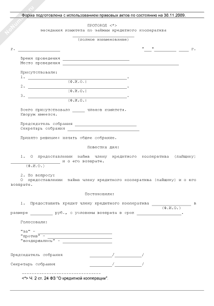 - 407Протокол заседания комитета по займам кредитного кооператива по вопросу предоставления займа члену кредитного кооператива (пайщику) и его возврата