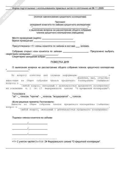 - 401Протокол заседания комитета по займам кредитного кооператива о вынесении вопроса на рассмотрение общего собрания членов кредитного кооператива (пайщиков)