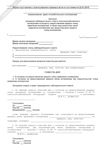 - 420Протокол заседания наблюдательного совета сельскохозяйственного кооператива по вопросу предоставления кредита члену правления кооператива, а также поручительства члена правления кооператива при предоставлении кредита члену кооператива