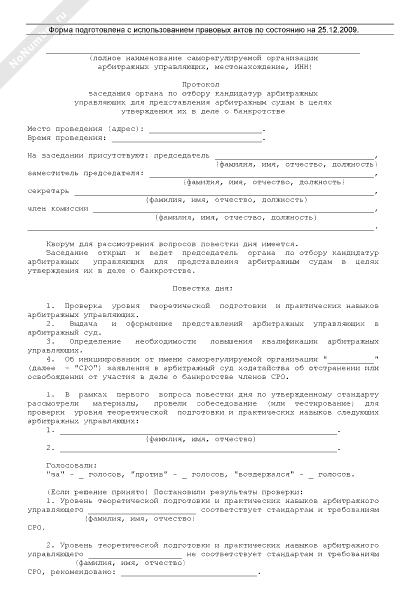 - 405Протокол заседания органа по отбору кандидатур арбитражных управляющих для представления арбитражным судам в целях утверждения их в деле о банкротстве