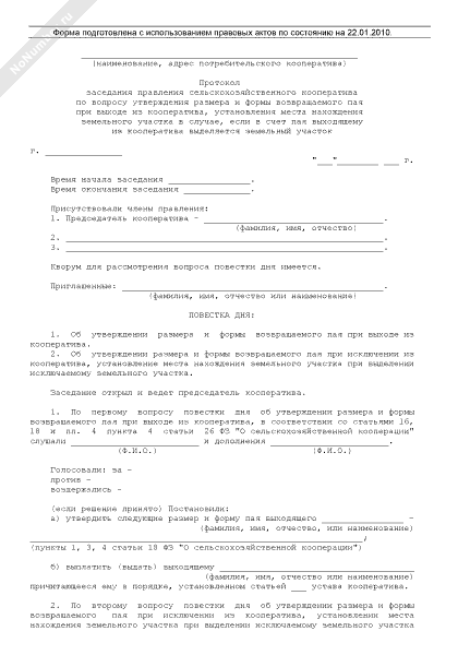 - 417Протокол заседания правления сельскохозяйственного кооператива по вопросу утверждения размера и формы возвращаемого пая при выходе из кооператива, установления места нахождения земельного участка в случае, если в счет пая выходящему из кооператива выделяется земельный участок