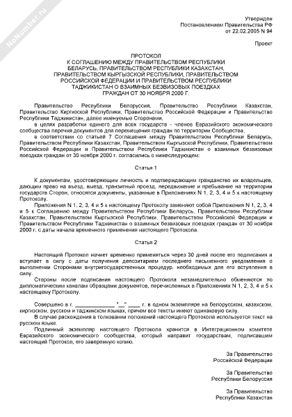 - 554Протокол к Соглашению между Правительством Республики Беларусь, Правительством Республики Казахстан, Правительством Кыргызской Республики, Правительством Российской Федерации и Правительством Республики Таджикистан о взаимных безвизовых поездках граждан (проект)