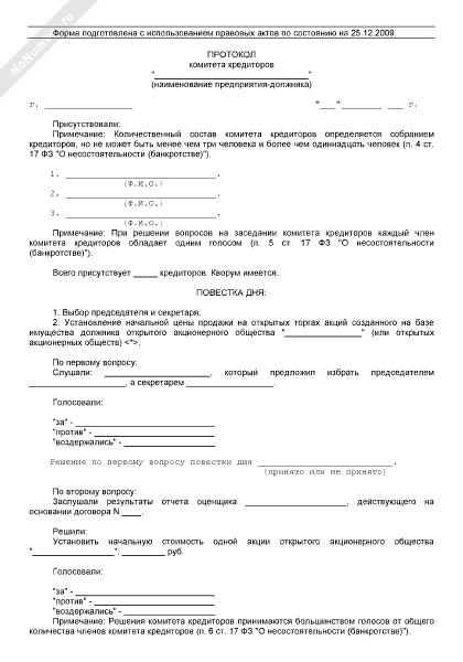 - 559Протокол комитета кредиторов по вопросу установления начальной цены продажи на открытых торгах акций созданного на базе имущества должника открытого акционерного общества или открытых акционерных обществ