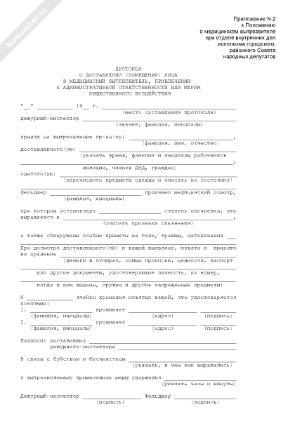- 630Протокол о доставлении (помещении) лица в медицинский вытрезвитель, привлечении к административной ответственности или мерам общественного воздействия